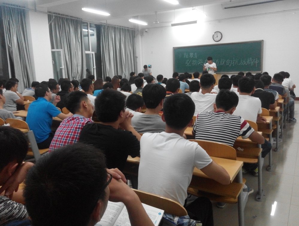 2015年是中国人民抗日战争胜利暨世界反法西斯战争胜利70周年,为让同学们更加深入了解历史,铭记历史,缅怀抗日先烈,传承和弘扬以爱国主义为核心的民族精神、培育和践行社会主义核心价值观,机电工程系于95晚在8号教学楼开展以“弘扬英雄传统的抗战精神”为主题的班会活动。