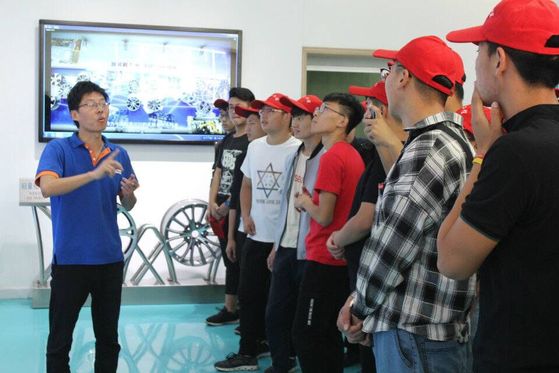 先后到达滨州盟威戴卡轮毂有限公司、山东渤海活塞股份有限公司后,两个公司的负责人都对同学们表示了热烈的欢迎,并对同学们进行了关于公司的发展历程,获得奖项,公司规模等的详细介绍。在渤海活塞,马主任带领同学们进入各个加工车间进行实地参观,并对每一个机械进行了详尽的介绍,同学们在参观中也积极的与马主任互动。在盟威戴卡轮毂有限公司,同学们被车间里的全自动化生产深深的吸引住,不断的向老师、带队人提出自己的疑问,在盟威戴卡的展览室里,同学们看到了宝马、奥迪、劳斯莱斯等各个知名汽车的轮毂,激发了同学们的热情。