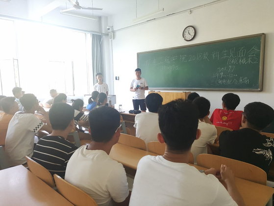 在班主任助理带领18级新生们参观完学校和实验室后,班主任助理们将各个班级的同学带到了各自的教室,在各个教室里,班主任助理们先对18级新生们表示了热烈的欢迎,向18级的新生们介绍自己,并且将在机电工程学院里需要注意的事项无所保留的传授给新生们,尤其是在军训期间的生活问题,例如做好防晒工作,不能缺水,要顿顿吃饭,不能空腹去军训,将自己在往年军训中得到的经验与教训都传达给18级的新生们,希望新同学们能够更好的适应新生活。另外,2018级新生们也都做了自我介绍,展示自己的才艺和讲述自己大学的感受,这场见面会开展的十分顺利。