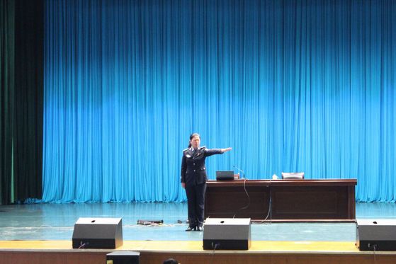 大会伊始,董警官分析了当前的道路交通安全形势,并以《安全法》等法律法规的有关规定;作为交通参与者,应该注意的问题;交通事故发生时,我们应该怎么做三个方面进行了详细的讲解。然后董警官向同学们介绍了各种道路的区分方法、交通标志的含义、以及八种交通警察指挥手势信号,并亲自示范了指挥手势信号。然后董警官举出一系列的真实事例,并播放了相关事例的视频。生动鲜活的案例令同学们意识到交通安全的重要性。最后董警官劝诫同学们要牢记安全规则于心,对自己负责,对家人负责,严格遵守交通规则。