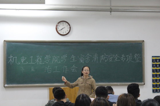 为进一步加强学生宿舍消防安全管理,杜绝学生宿舍发生消防安全事故,保障学生人身安全和财产安全,深入贯彻落实山东省教育厅《关于开展“狠抓落实 强化学生宿舍消防安全专项整治”行动的通知》文件精神。我院于4月15日晚七点半在八教101开展宿舍消防安全专项整治工作会。辅导员靳雪银老师主持此次会议,16级、17级、18级全体学生干部参加此次会议。