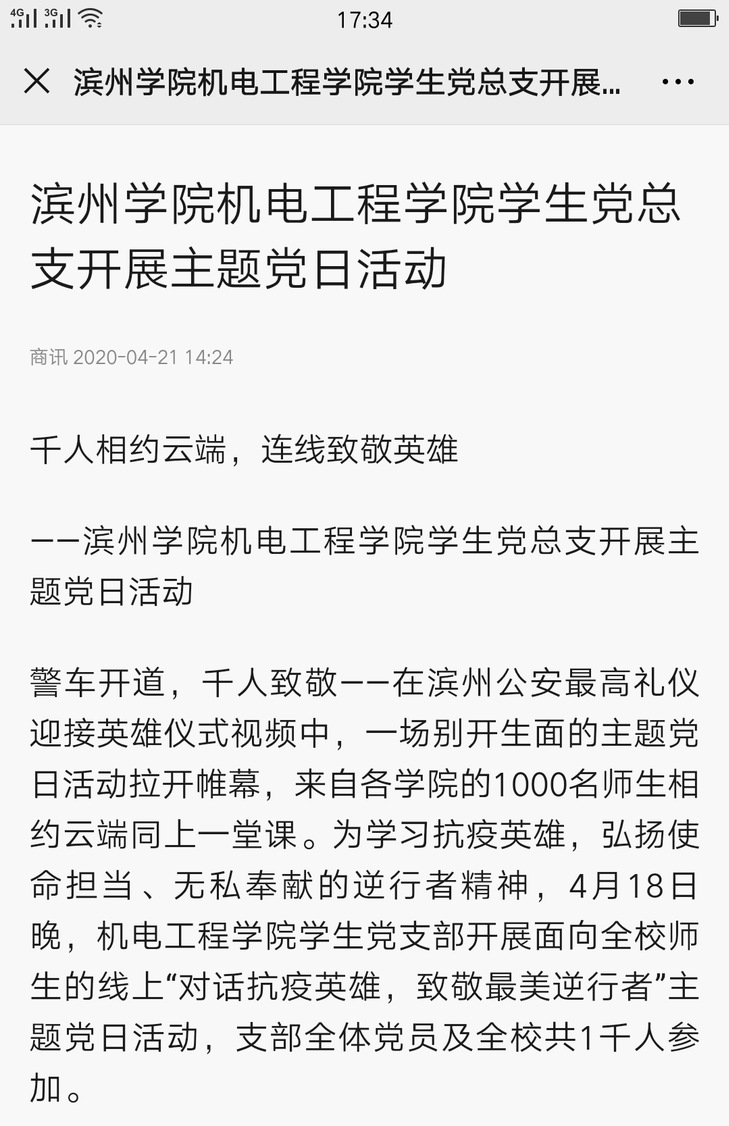 近日,我院学生党支部开展的“对话抗疫英雄,致敬最美逆行者”主题党日活动效果显著,现已被学习强国、新浪网、滨州日报等多家主流媒体广泛宣传报道,引发社会热烈反响。