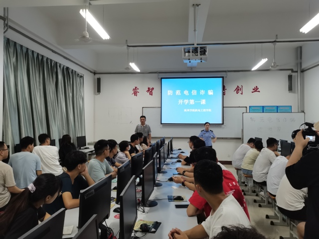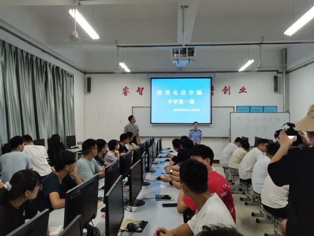 为增强学生的防诈骗意识,提升防诈骗能力,8月30日,机电工程学院联合彭李派出所在工程训练中心201教室开讲防诈骗主题的开学第一课。本次开学第一课的开讲嘉宾是彭李派出所资深民警张警官,机电工程学院辅导员、全体学生干部参加本次活动。