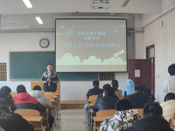 中石化第十建设有限公司是中石化炼化工程(集团)股份有限公司旗下的全资子公司,公司总部位于山东省青岛市黄岛区,注册资本3.5亿元,资产总额40亿元。宣讲过程中,公司的人事详细地为向同学们介绍了企业今年的招聘岗位和应聘要求,并真诚地希望同学们能够来到企业工作。在现场提问交流环节,毕业生纷纷就自己感兴趣的薪资待遇、未来晋升途径与招聘单位进行交流,现场有10余位毕业生达成初步就业意向。