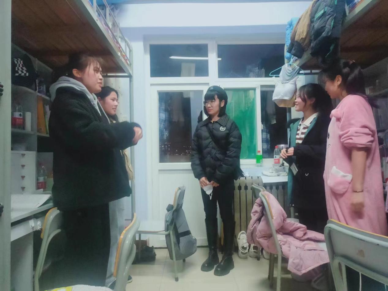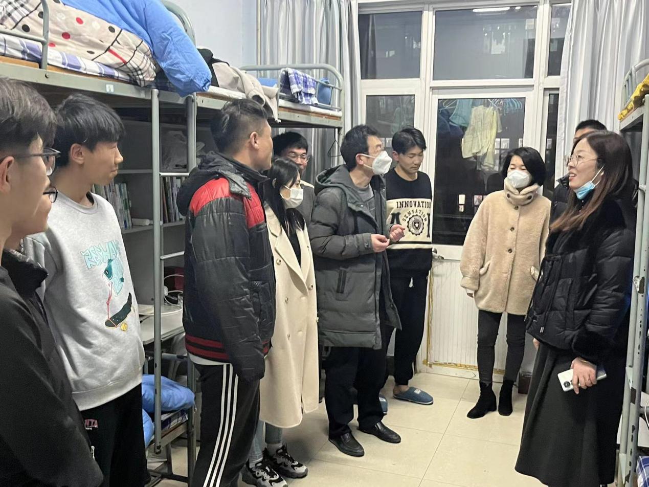 王春磊详细询问大家的学习生活现状,细心查看宿舍安全、卫生状况和硬件设施。王春磊叮嘱同学们要努力学习,勤整内务,养成良好的生活习惯,共同营造温馨舒适的生活环境和比学赶超的优良学风。李辉以聊家常的方式向学生询问学习生活等情况,了解学生的思想状况和实际困难,听取学生的意见建议,并对学生提出的问题进行了贴心的解答。各位班主任老师来到本班学生所在宿舍,了解学生近况并为大家答疑解惑。