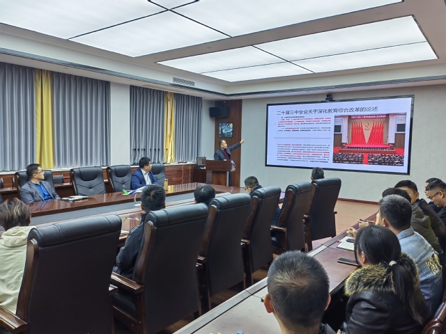 为深入学习领会、坚决贯彻落实党的二十届三中全会关于教育工作改革的重要部署以及习近平总书记在全国教育大会上的重要讲话精神,机电工程学院党总支邀请马克思主义学院副院长王勇军以《深化教育综合改革,推进教育强国建设》为题,为全体教职工进行宣讲。本次宣讲会由学院党总支书记王丕琢主持。