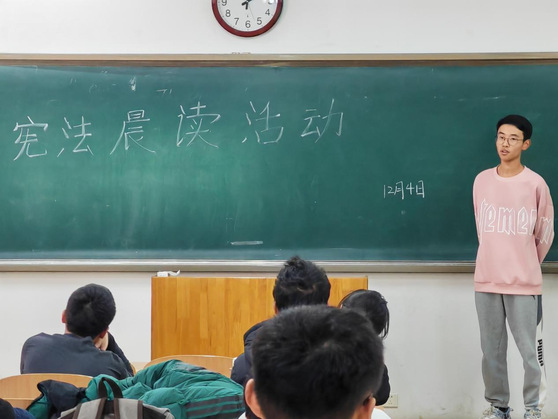活动现场,同学们在领读人的带领下,庄重诵读宪法条文。“中华人民共和国是工人阶级领导的、以工农联盟为基础的人民民主专政的社会主义国家。社会主义制度是中华人民共和国的根本制度……”,通过诵读,同学们深刻领会宪法所规定的国家根本性问题,以及宪法在国家法律体系中的至高地位与法律效力。