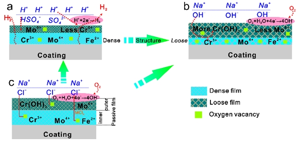 为探究不同腐蚀离子对Fe基非晶涂层耐腐蚀和耐摩行为的影响机制,本研究采用爆炸喷涂技术在Q235钢基体上构筑Fe基非晶涂层,探究了Fe基非晶涂层在H2SO4、NaCl和NaOH腐蚀溶液下的腐蚀和摩擦行为,发现涂层的腐蚀磨损性能直接受到其微观结构和摩擦磨损界面相互作用的影响。由孔隙和结晶相引起的化学成分的不均匀分布会降低涂层的耐腐蚀性。氢离子富集加速了Si3N4球的阳极极化和水合反应,而高浓度的氢氧根离子则具有相反的效果。由于水化反应程度高,MoO3含量高,涂层在酸性溶液中的摩擦系数和磨损率最低,而在NaOH溶液中的涂层摩擦系数和耐磨率高于H2SO4和NaCl溶液。