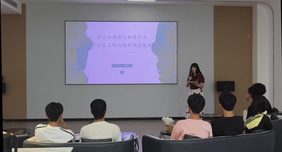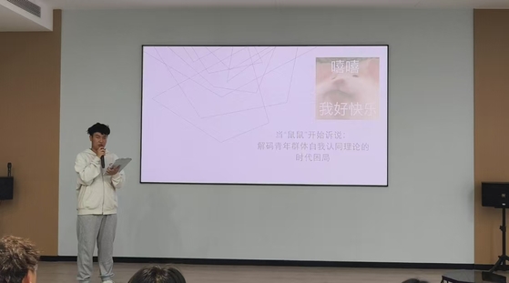 在互动环节,心理委员引导同学们分析“鼠鼠文学”里的共同符号即有关鼠的表情包,通过群体符号进行交流,引发同学们对当下青年人的生活现状,包括心理问题、就业困难、学业压力等的讨论。在彼此的分享、认同、共情和鼓励中,同学们从中建立并加强与世界的联系,获得了“群体认同”的庇护、和他人同属一个阵营的踏实感,实现了情绪宣泄和社交满足,在现实压力下获取片刻的喘息和难得的治愈。